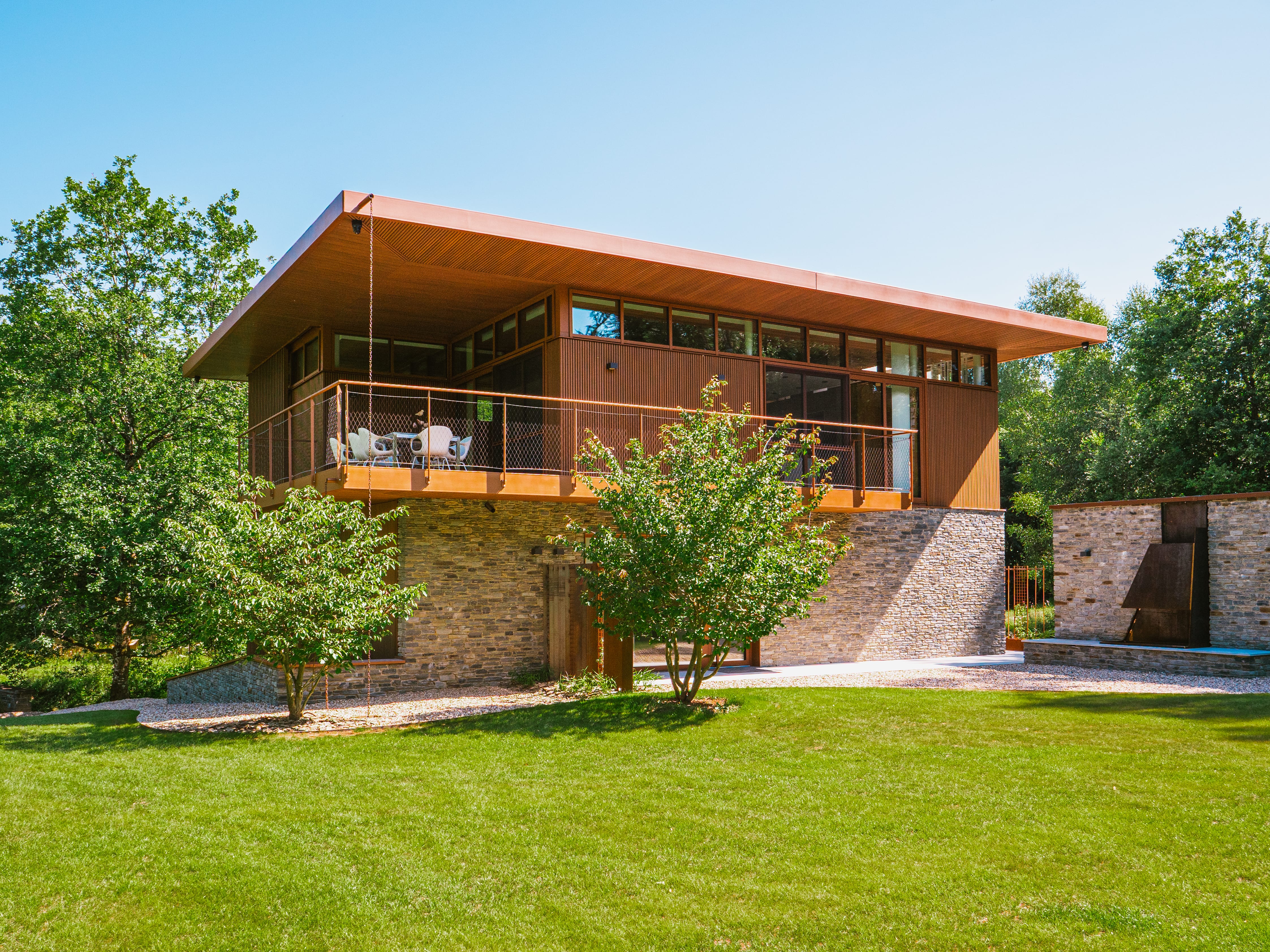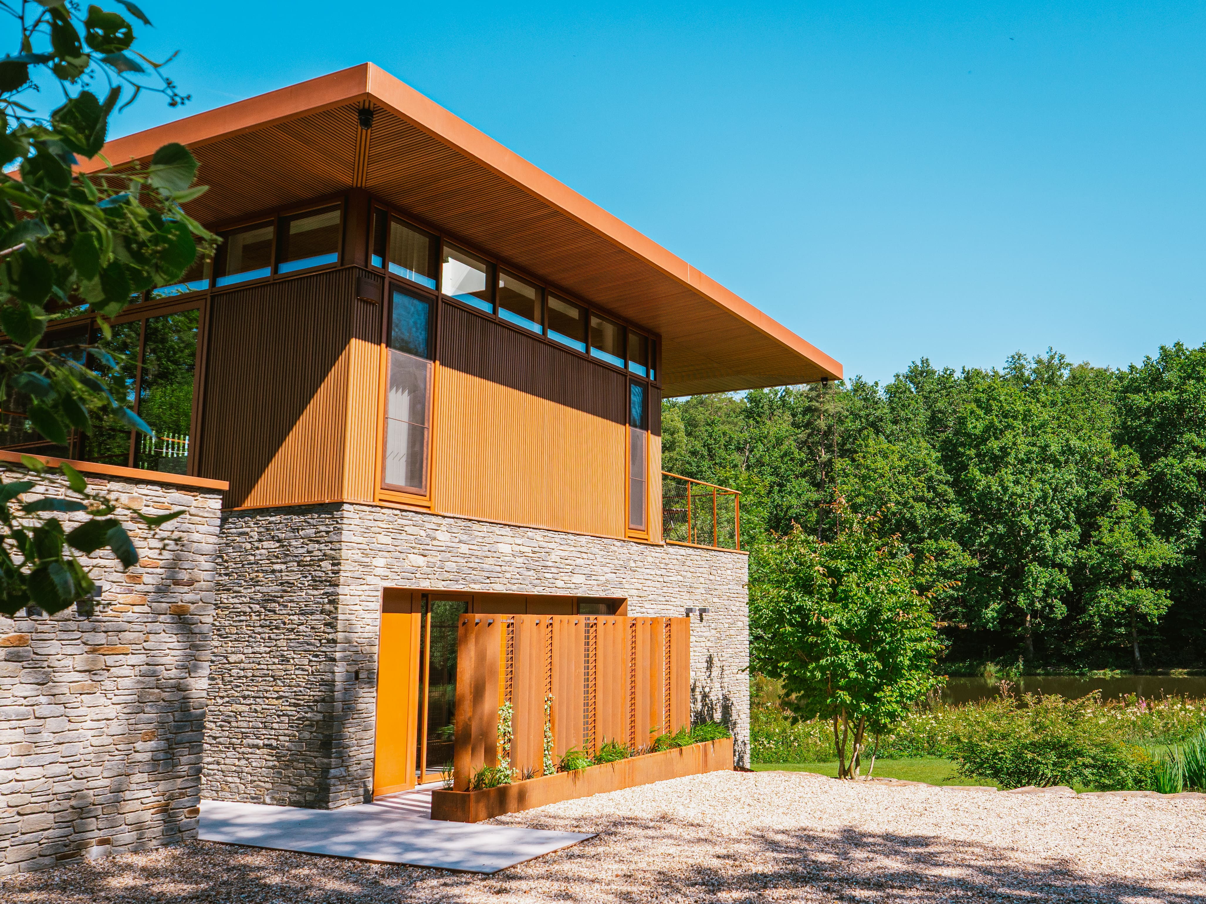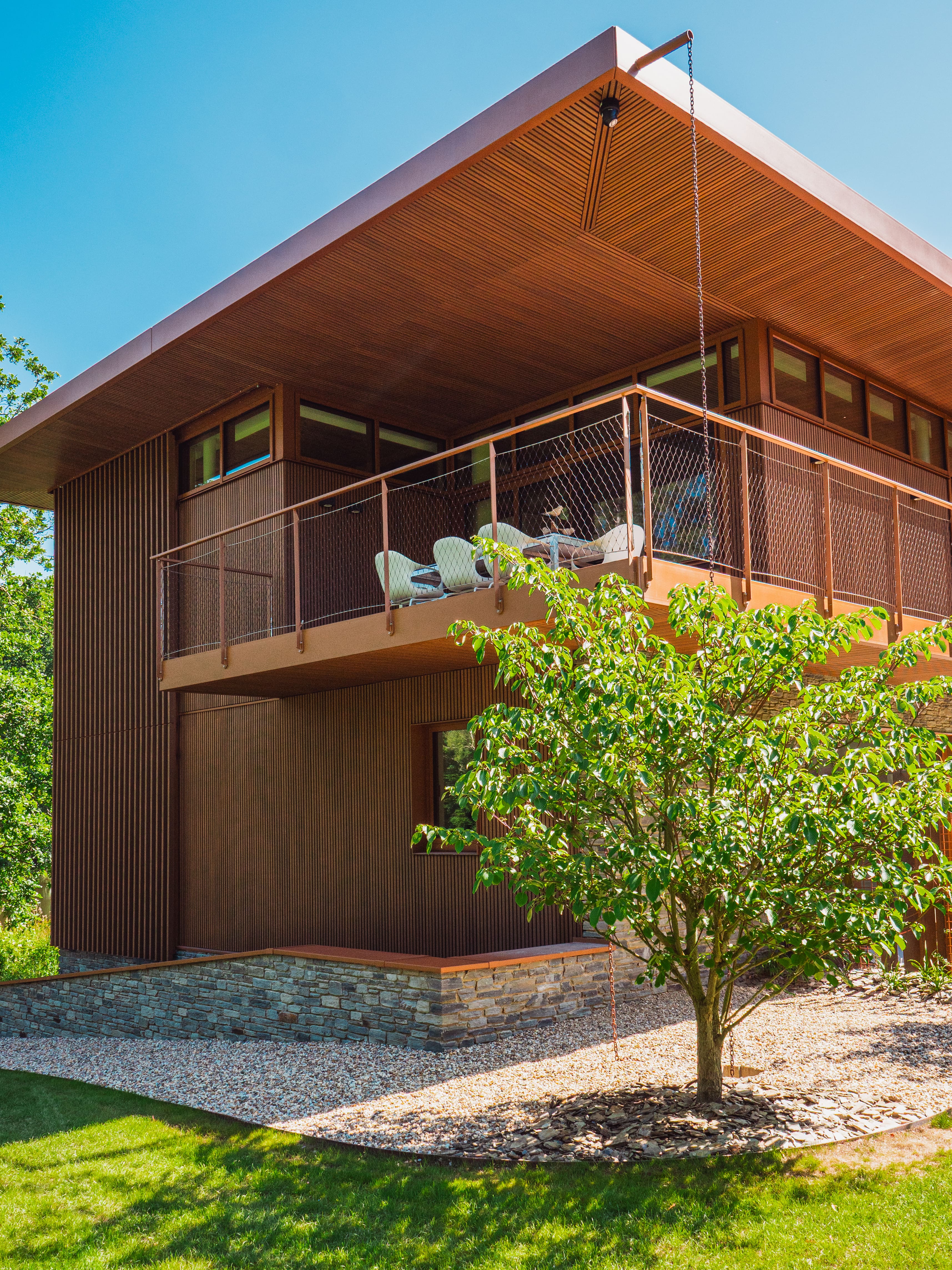 Rundt om den moderne bolig, udført i en charmerende retro-stil, er der plantet talrige træer. Disse grønne beplantninger sikrer, at haven problemfrit går over i det omkringliggende landskab og tilbyder en anden stemningsfuld dekoration hver sæson. Det hele danner et strålende billede, som beboerne vil nyde i mange år fremover.