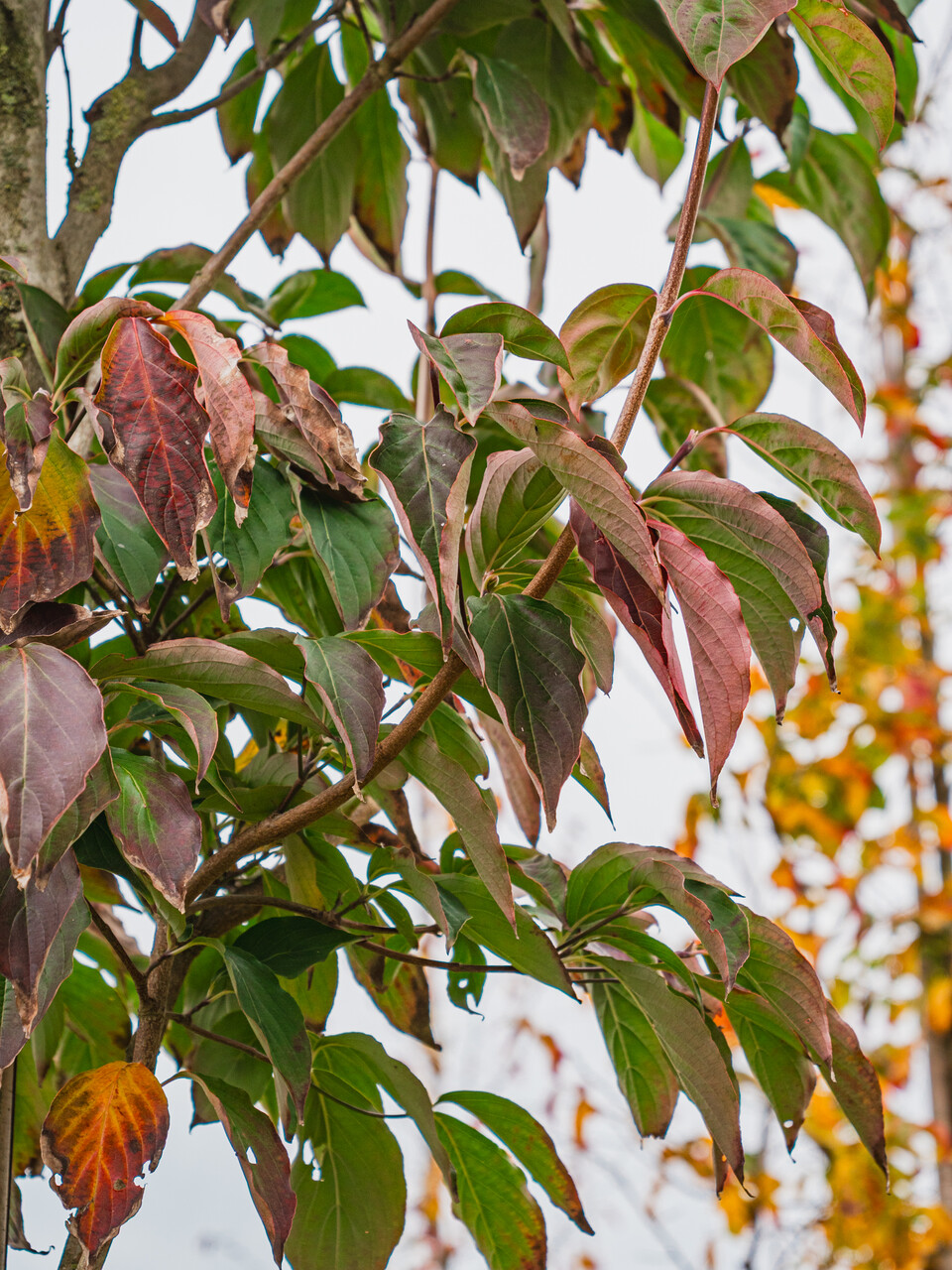 The leaves of Cornus kousa var. chinensis turn gul, rød in autumn.
