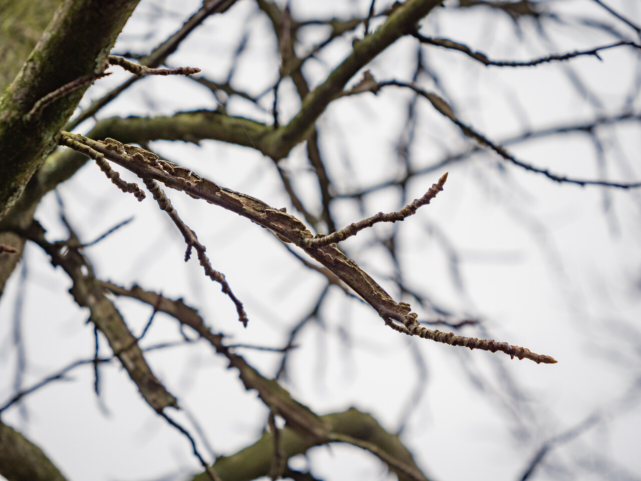 mørkegrå, dybt rillede, korkede vinger på grene og kviste