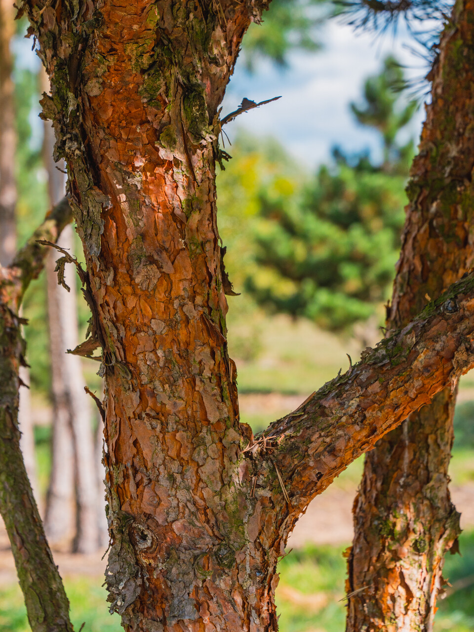 old bark is greyish brown, in rough strips, orange-brown higher up