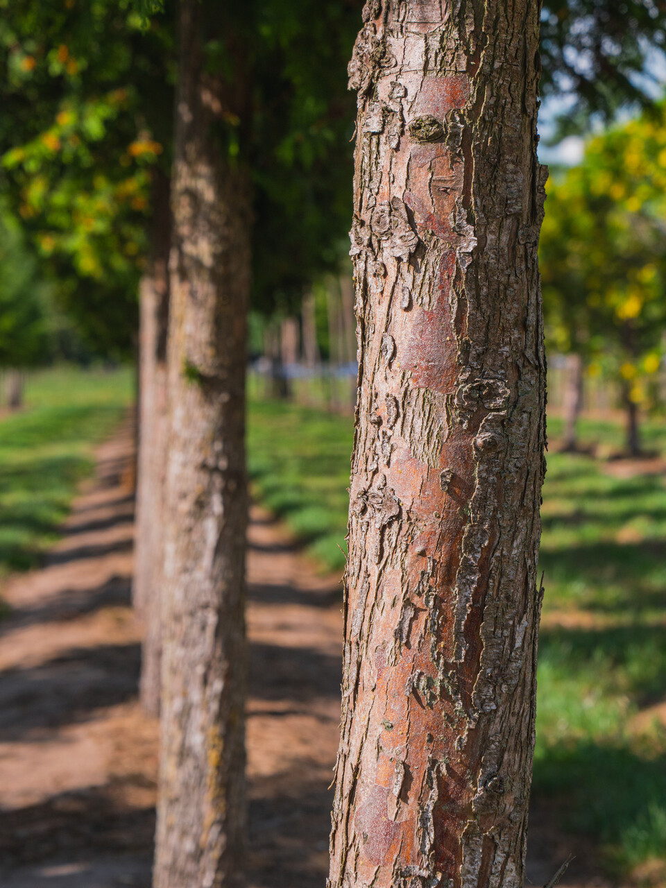 kviste grønne til orangebrune, bark rødbrun, skældannelse i smalle strimler
